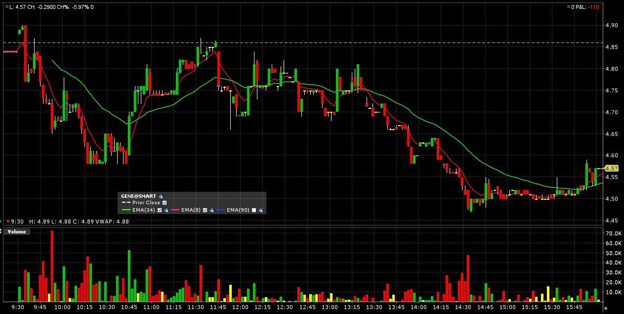 GERN: I was swing short this overnight. Decided to get rid of the short when it wasn't working out for roughly breakeven. Great change of bias. This is an example of a stock I would have crushed if I hadn't stopped out for the day, that triangle breakout is perfection!