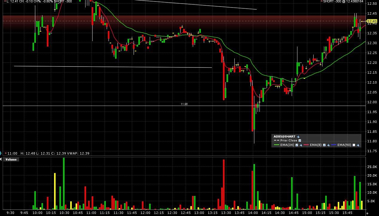 HZNP: Got short into the r/g zone. Did a really good job of not getting faked out. Was a little ambitious with targets, this is the one I was referring to when I said I didn't quite manage positions enough. Given the historical tendency for it to save itself I should have been taking quite a bit off. In general shorted pops and covered dips. Overall good trading. I think the management thing really depends on the situation. For example, this is a trade which has a historical tendency to save itself, plus is still well within a defined uptrend on the daily. It is also nearing it's ATR, and is a intraday trade not a swing. Compare to say ADXS where it's not in an uptrend on daily (but shorter term momo is up), and it's a swing trade, and I haven't quite managed to get my desired position size yet. Even so I probably should have covered ADXS at the lows (because it was an ATR move).